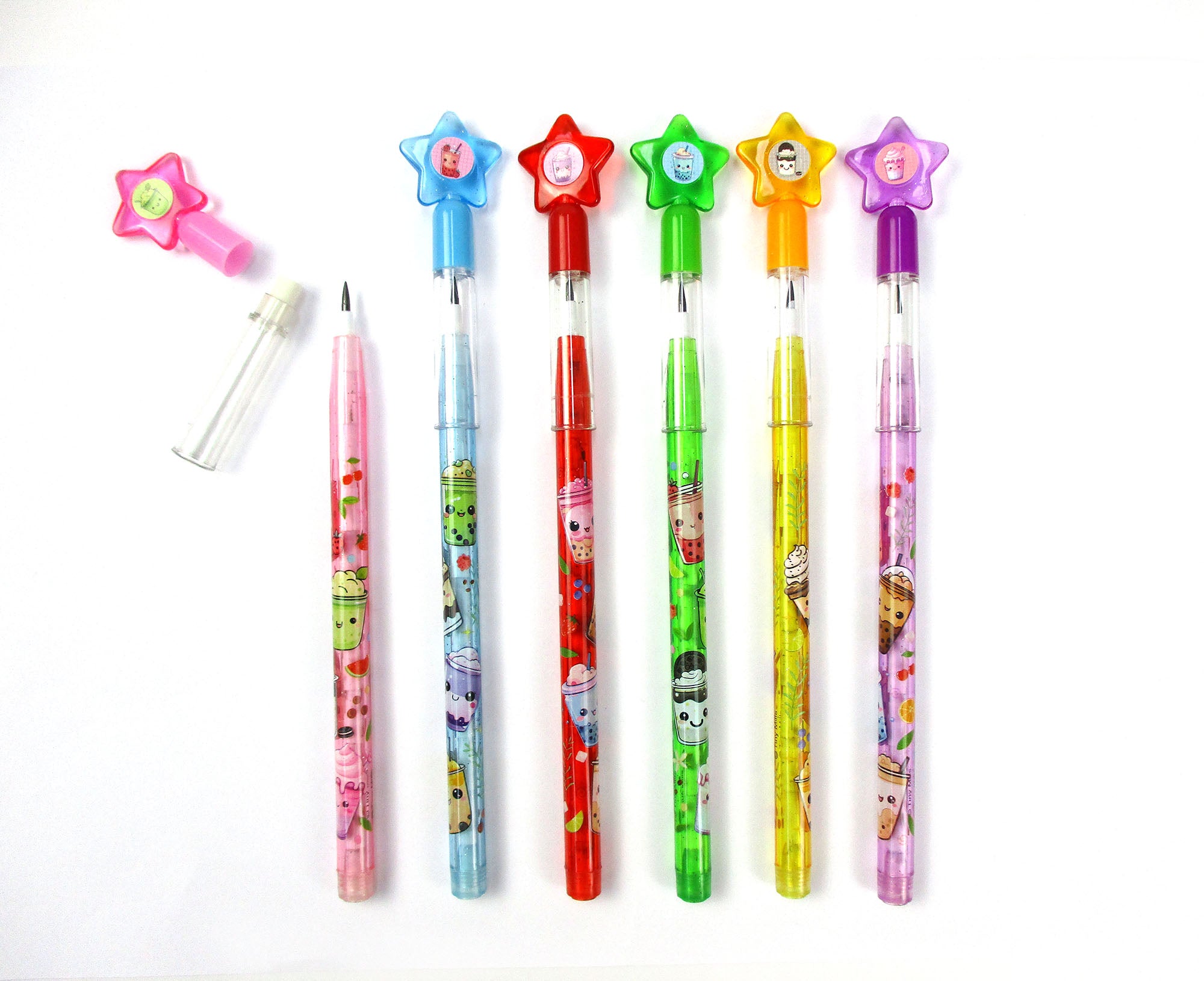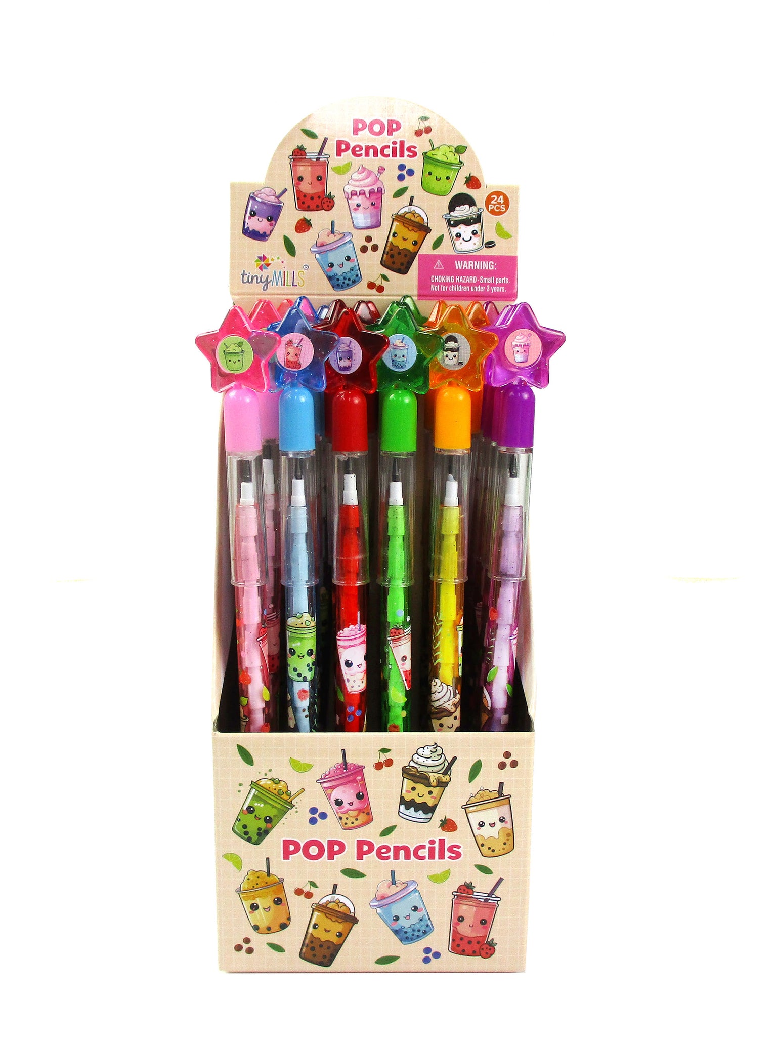 Elevate your party favors with Boba Multi Point Pencils! Each set contains 24 pencils, featuring 11 stackable #2 leads and an eraser hidden under a star topper. No need to sharpen—just pull out the dull lead to quickly reveal a fresh one. These pencils make perfect gifts or favors for birthday parties and more. Pair them with our boba milk tea collection or mix and match to create an unforgettable party bundle your guests will love.