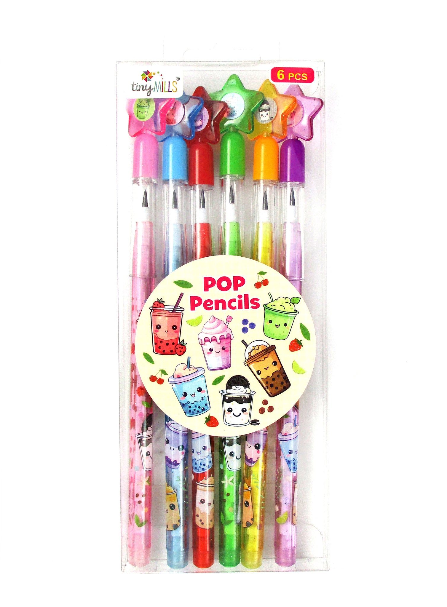 Enjoy endless writing fun with the Boba Stackable Multi Point Pencils, a set of 6 perfect for boba fans. Each pencil features 11 #2 stackable leads and an eraser hidden under a charming star topper—no sharpening needed! Simply push out dull leads and reveal new ones easily. These pencils make delightful party favors, gifts, or carnival prizes. Pair them with our boba milk tea collection or mix to create a unique party bundle everyone will love.
