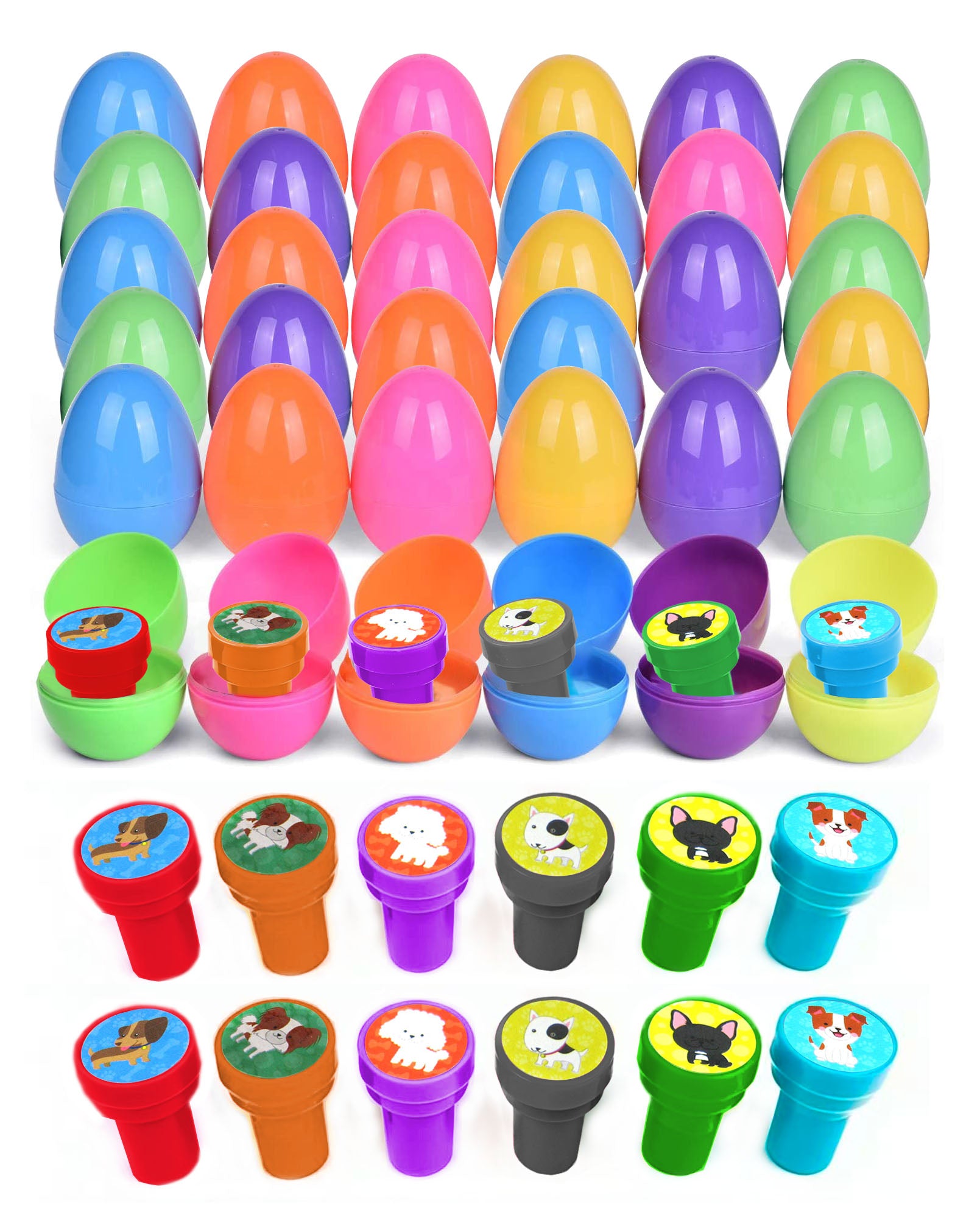 This 36 pack of Easter Eggs with Dog Stampers makes Easter celebration fun and unique! The set includes 36 multi-color Easter eggs and 36 dog themed stampers. The stampers fit inside each egg with room to add other little surprises! Kids will enjoy these for Easter egg hunts, Easter basket filler, and Easter goody bag stuffers as well as giveaways in classroom or in church. Stampers can be used for arts and crafts, counting exercises, decorating stationery, creating own greeting cards and more! Enjoy the rainbow of possibilities!