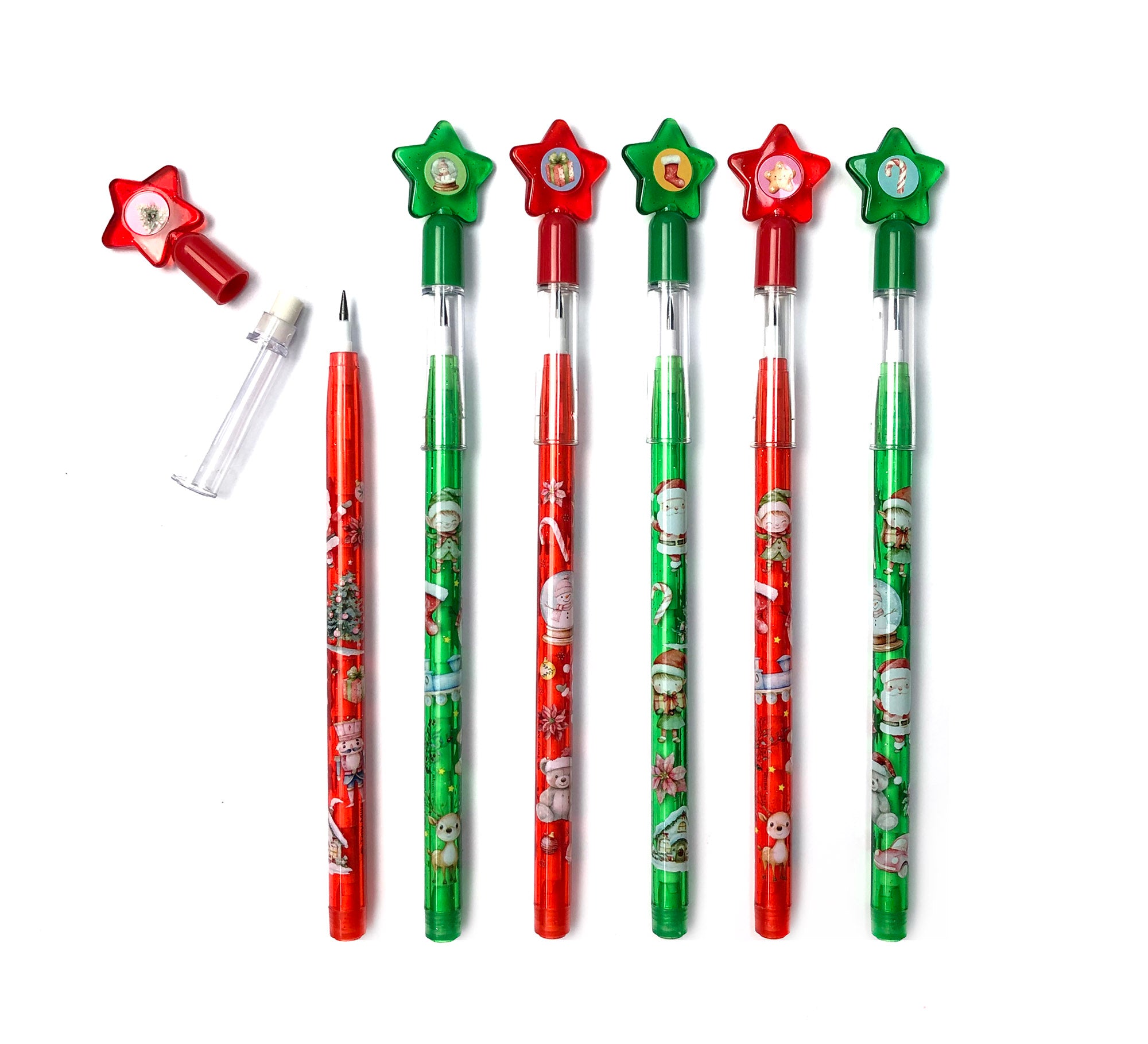 Celebrate the holidays with this set of 6 Vintage Rustic Christmas Stackable Multi Point Pencils, each featuring charming rustic designs. Each pencil contains 11 #2 leads and an eraser under a star-shaped topper. No sharpening needed—just push out the dull lead and push back up to reveal a fresh one. Perfect as holiday gifts, stocking stuffers, or party favors, these pencils add a nostalgic touch to your celebrations. Mix and match with our vintage Christmas collection to create a festive bundle everyone will cherish!